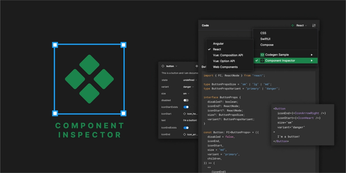 我构建了一个插件来回答这个确切的问题。当开发人员浏览包含 UI 组件的设计文件时,除了组件名称之外,他们主要关心一些特定属性的值。我想为专注于属性语言而不是视觉样式的组件生成代码。这个 Component Inspector 插件就是这样做的,它为不同组件框架(Angular、React、Vue 和 Web Components)中的组件定义和实例显示代码。它主动忽略了 Figma 端的一些属性语言,以及代码端一些不重叠的属性语言,目的是生成足够的代码来帮助开发人员以精确的语言翻译视觉样式。创建这个插件是我接受这种共享语言理念的最平易近人的方式——反映我认为在实践中最有用的版本。