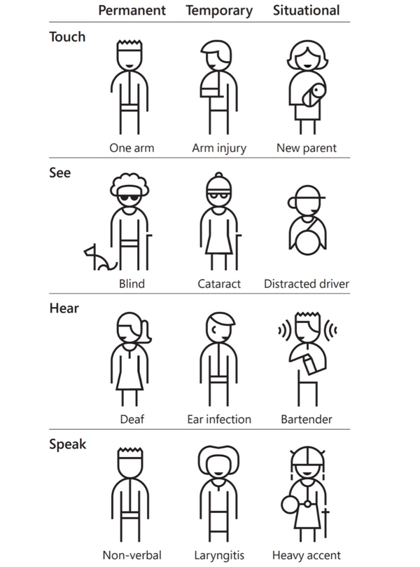 微软的包容性设计工具包强调了我们如何从设计师对无障碍的关注中受益。下表列出了不同类型的暂时和永久残疾。